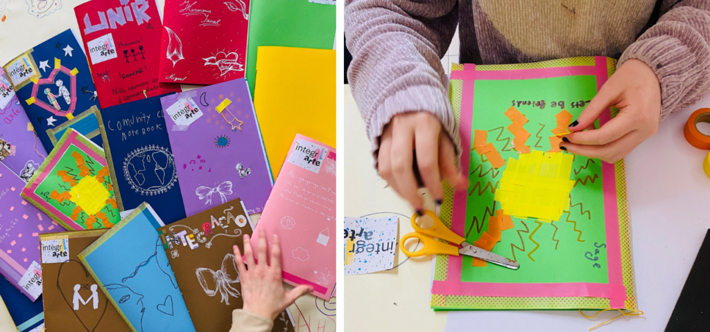 Ana Verónica volta para a atividade principal da sessão, a criação de um caderno pessoal, que irá acompanhar cada criança ao longo de todo o projeto. Feito com cartolinas e cosido à mão na lombada com linha, cada caderno foi decorado no exterior com temas de união, igualdade e encontro, palavras e imagens que as próprias crianças escolheram para dar rosto ao que sentem. Na primeira página do interior, colada com cuidado, ficou uma fotografia polaroid de cada participante: um registo do presente que, daqui a anos, quando estas crianças forem adultas, terá a beleza agridoce de uma memória guardada.